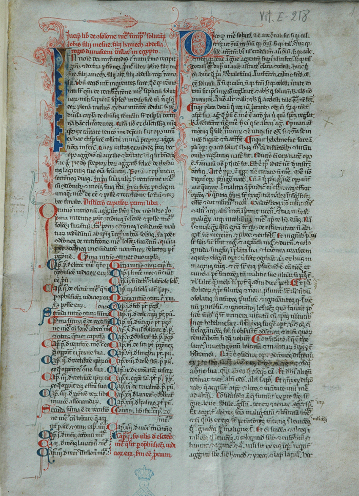 JOHANNES MESUE (?-1015), Liber de consolatione medicinarum simplicium …; Incipit liber Johannis Damasceni filij Mesue grabatin quod est aggregatio et antitodarium electuariorum et confectionum. Membr.; sec. XIV; mm 290 x 207; cc. 39; testo disposto su due colonne, iniziali decorate in oro e filigranate in rosso e blu. Segn.: Vitt. Em. 218 M.B.F. |