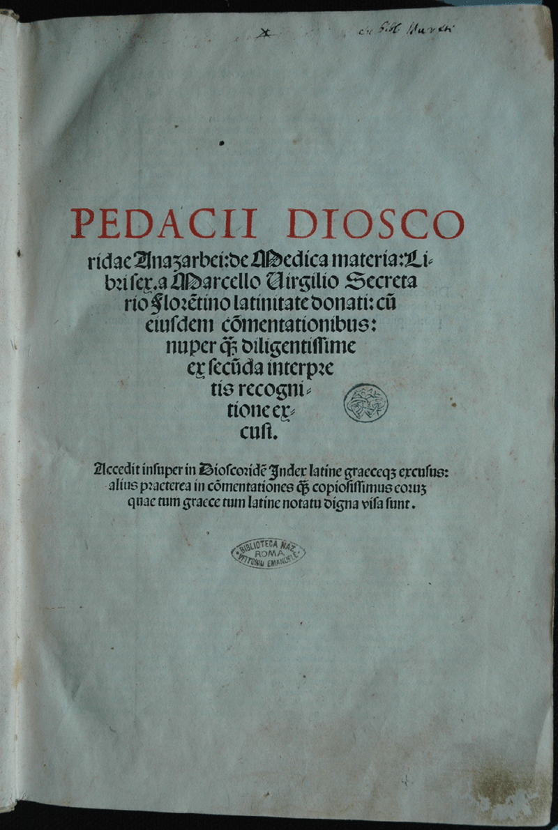 PEDANIUS DIOSCORIDES (I sec. d. C.), De medica materia libri sex a Marcello Virgilio secretario florentino latinitate donati: cum eisudem commentationibus …, Florentiae, per heredes Philippi Iuntae, 1523. In alto è visibile l'ex libris: "ex bibl. Mureti", che attesta l'appartenenza del volume alla biblioteca di Marc'Antonio Muret, celebre umanista francese vissuto in Italia nel corso del XVI secolo. La sua biblioteca confluì poi in quella del Collegio Romano. Proveniente dalla Biblioteca Major del Collegio Romano. BNCR: 68.9.E.2 G.D.A. e A.Z. |