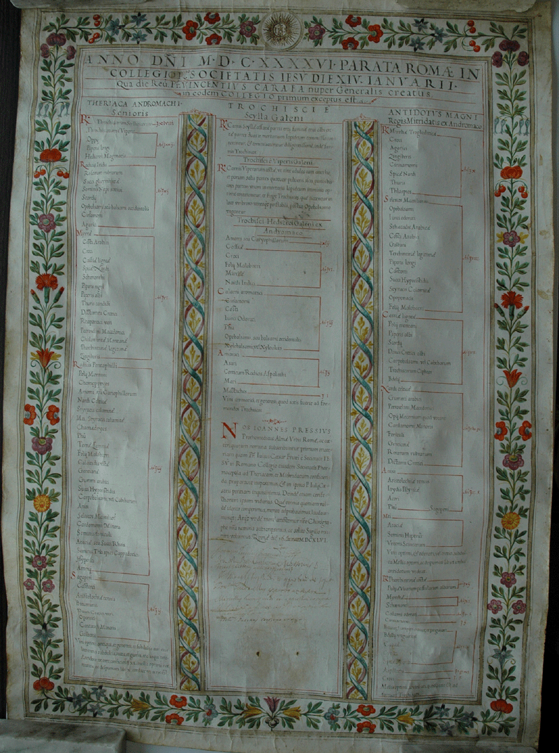 Ricettario della triaca, di alcuni tipi di trocisci e del mitridato della Farmacia della Compagnia di Gesų al Collegio Romano nell'anno 1646. Membr.; sec. XVII (1646); mm 830 x 585; decorazione a colonne e a forma di cornice con motivi floreali acquerellati a vari colori. Segn.: Ges. 1382 Nella Biblioteca Nazionale Centrale di Roma č conservato un altro Ricettario della triaca, sempre proveniente dal Collegio Romano e datato 1630 con segnatura A.31.59. M.B.F. |