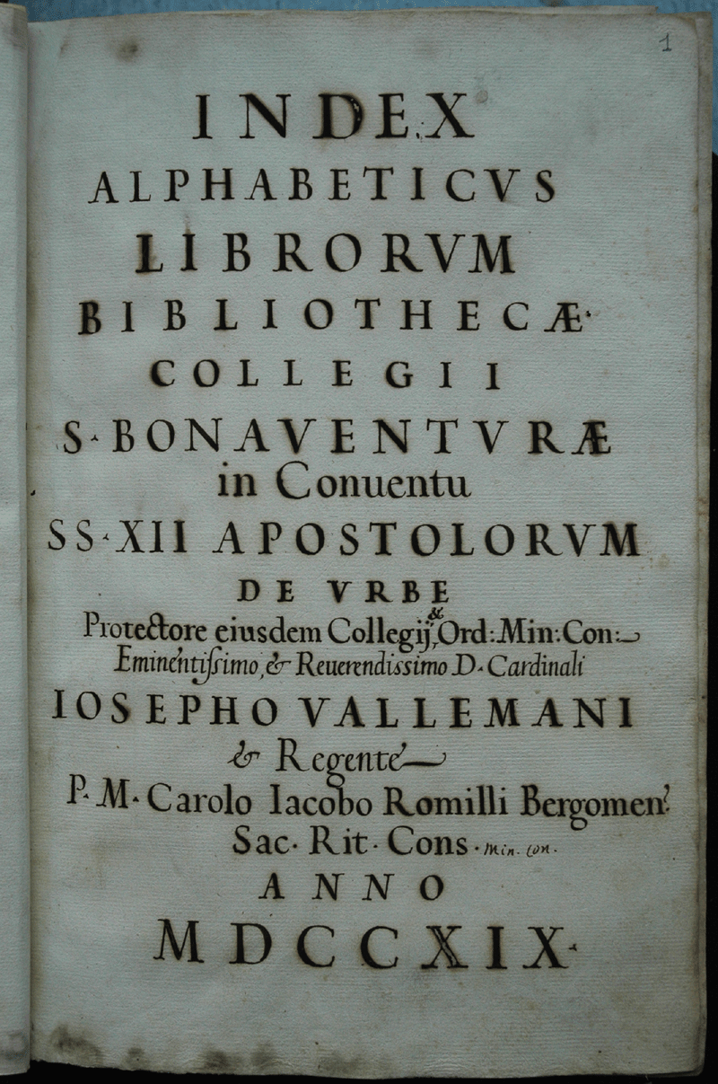 Catalogo della Biblioteca del Collegio di S. Bonaventura ai SS. XII Apostoli di Roma. Cart.; sec. XVIII-XIX (1719-1725;1835-1856); mm 355 x 230; cc. I-III, 220, IV-VI. Catalogo alfabetico per autore cui segue alle cc. 143r-220r un Index materiarum, e in particolare alle cc. 209r-220r Philosophia, Medicina et Matematica. Proveniente dal Collegio di S. Bonaventura ai SS. XII Apostoli. Segn.: Ant. Cat. 4 S. Bonaventura G.D.A. e A.Z. |